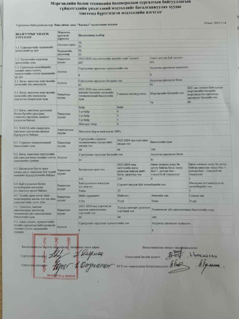 МЭРГЭЖЛИЙН БОЛОН ТЕХНИКИЙН БОЛОВСРОЛЫН ГҮЙЦЭТГЭЛИЙН ҮНЭЛГЭЭ